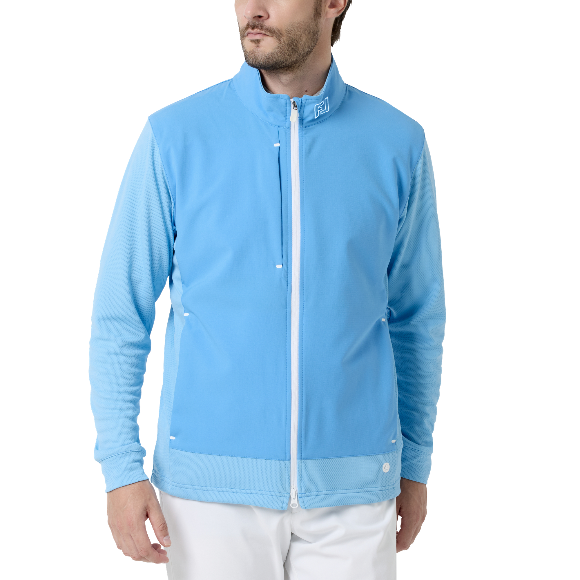 ストレッチ性に優れたニット素材と撥水加工生地を組み合わせ、天候変化にも対応するハイブリッドジャケット。吸湿速乾機能で快適さを保ちつつ、スイングを妨げない設計。脱ぎ着しやすいフルジップ仕様と洗練されたディテールが、プレー中も上品なスタイルを演出します。