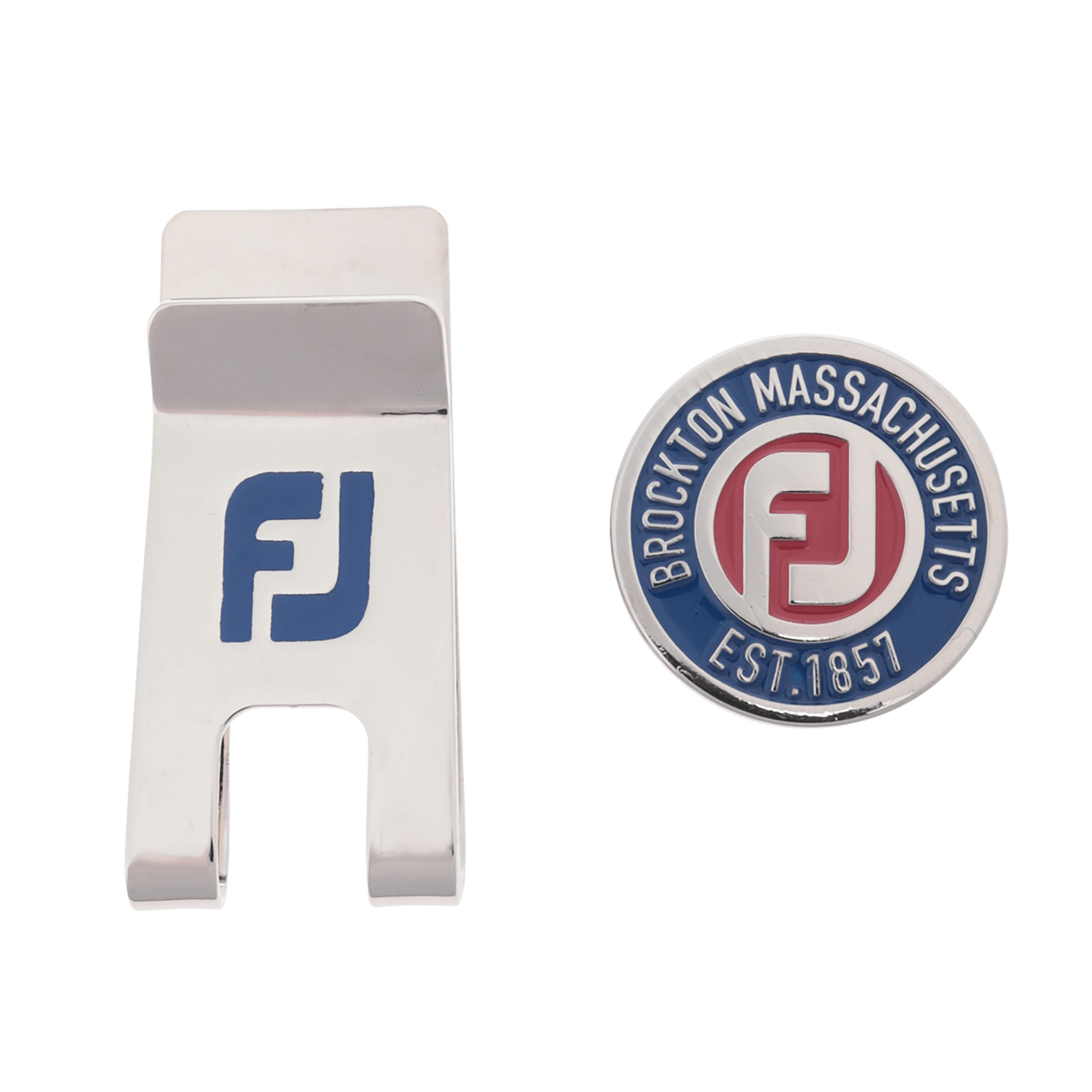 キャップのつばにつける使いやすいクリップタイプ。FJの創立年1857年と誕生の地である米国マサチューセッツ州ブロクトンをあしらったデザインのボールマーカー。