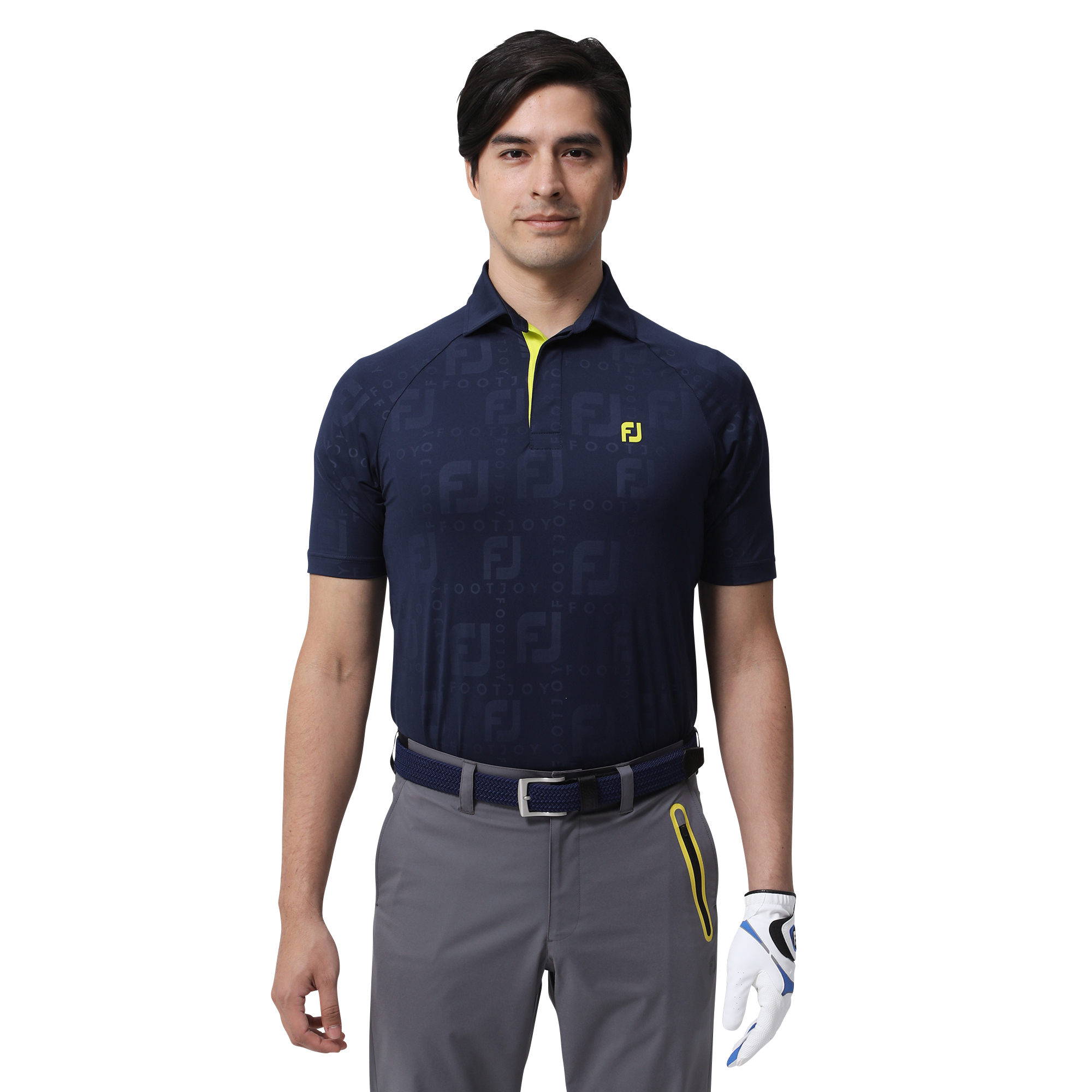 FJロゴとFOOTJOYワードグラフィックを組み合わせ、エンボスで表現した今までにないデザインのポロシャツ