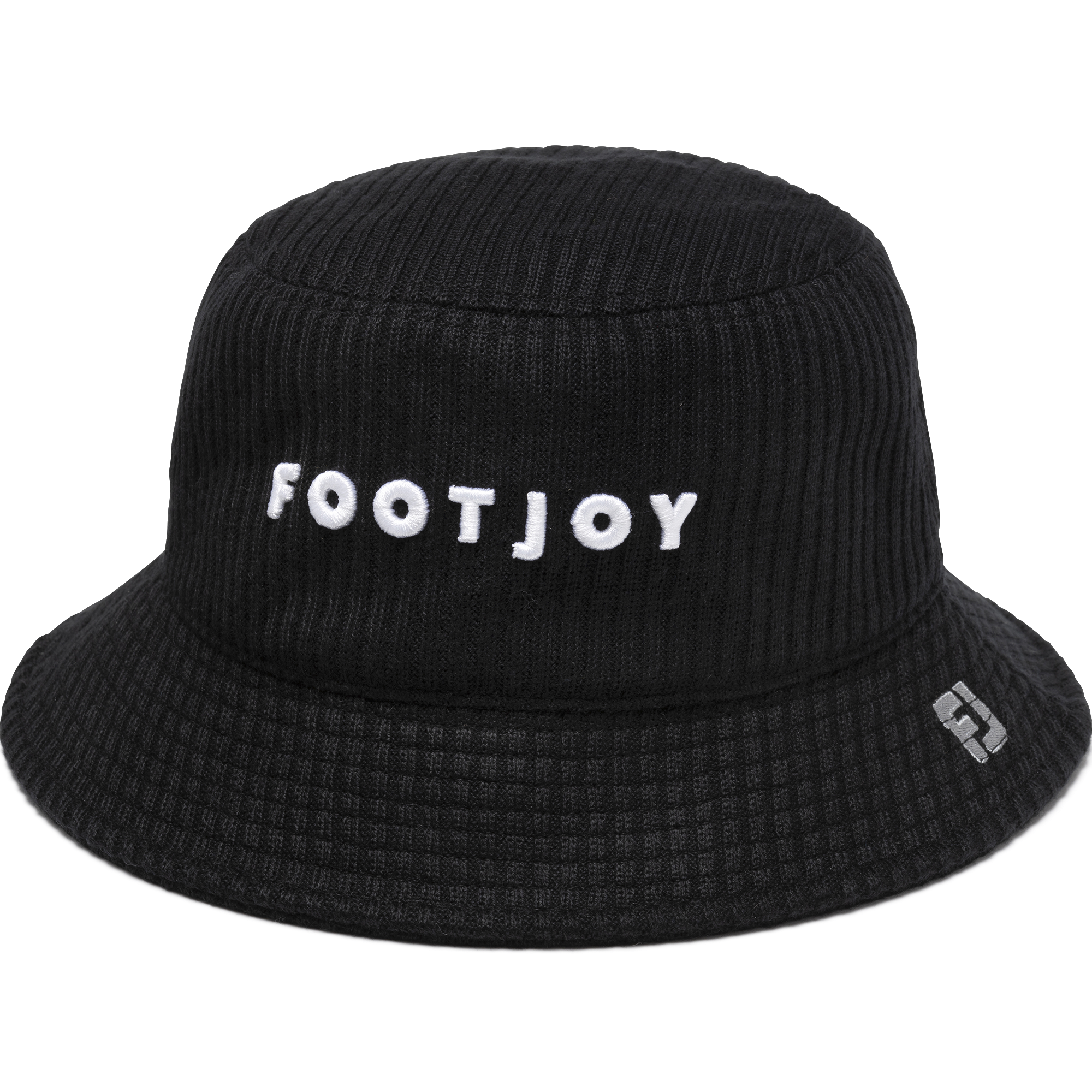 薄手のニットで編んだバケットハット。新しいFOOTJOYワードマークと左前に入れたFJロゴがデザインポイント。