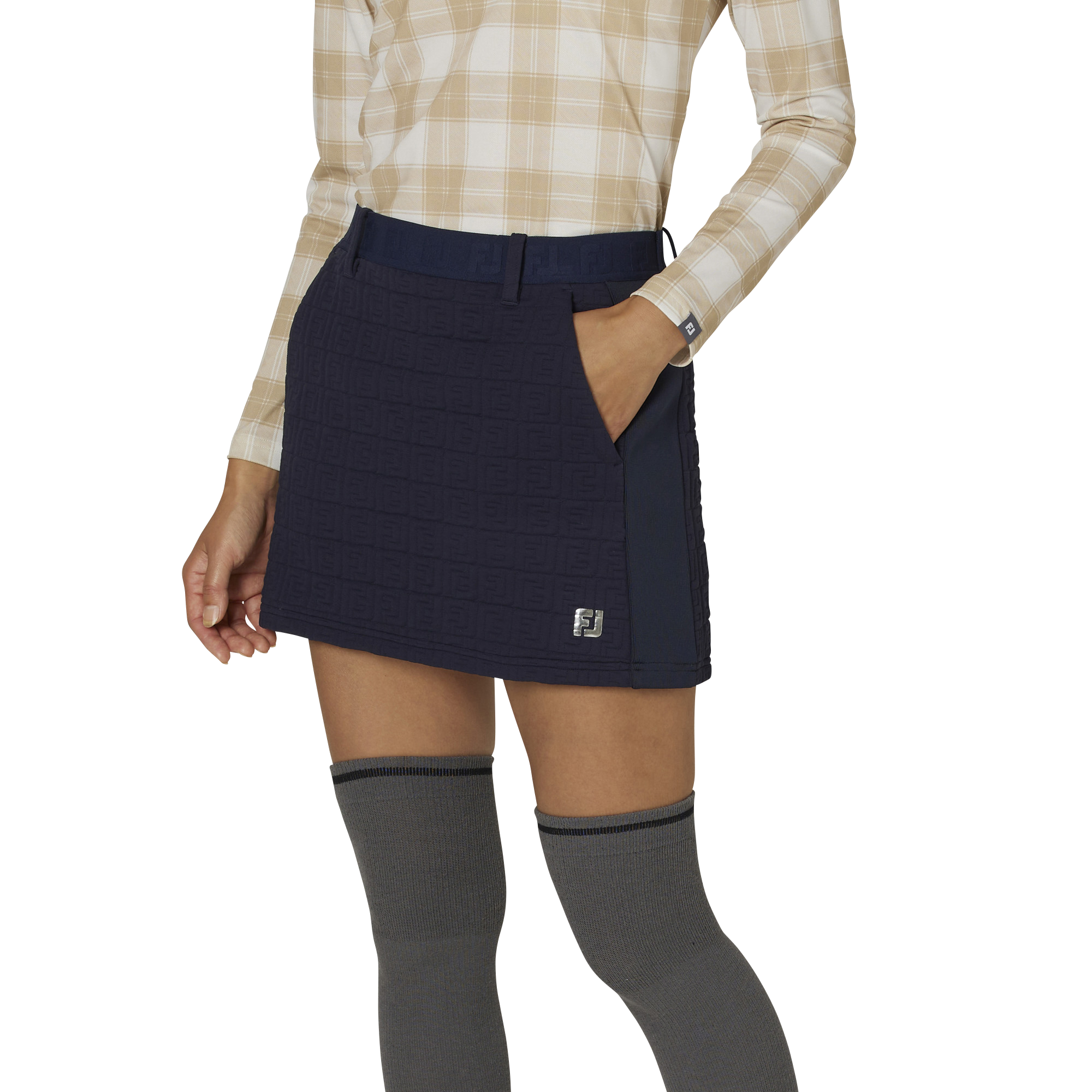 ストレッチ性が高く耐久性のある素材を採用したプルオンスカート。総柄のFJロゴをキルティング加工で表現したデザインがポイント。ウェストゴムのプルオン仕様によりストレスなく着用できる1枚です。