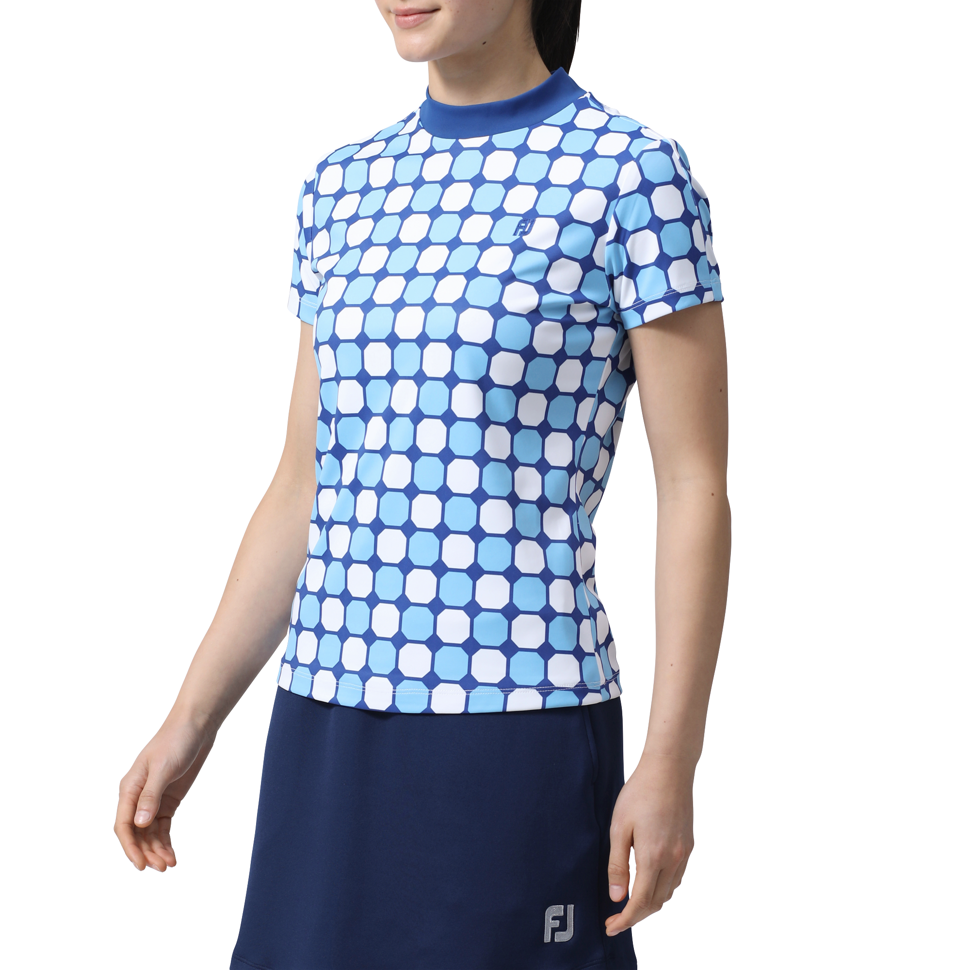 肌触りに優れたなめらかな表面感の素材を使用した半袖モックネックシャツ。多色使いのオクタゴンパターンのプリントはコースで映えるアイテムです。同じ素材を使用した、FJW-S24-P09/スカートと組み合わせたワントーンコーデがおすすめです。