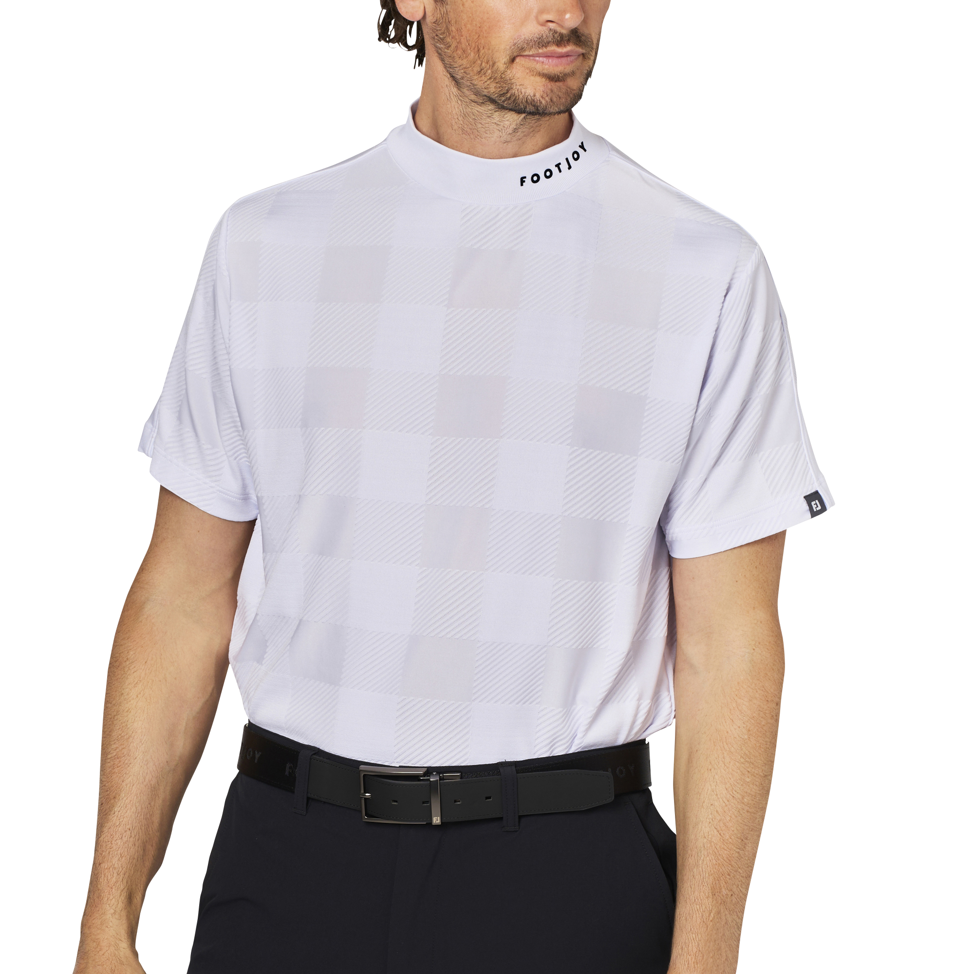シックなチェックジャカード柄がシンプルながらも洗練された印象を与え、モックネックデザインがスポーティーかつクールな雰囲気を演出した一枚です。