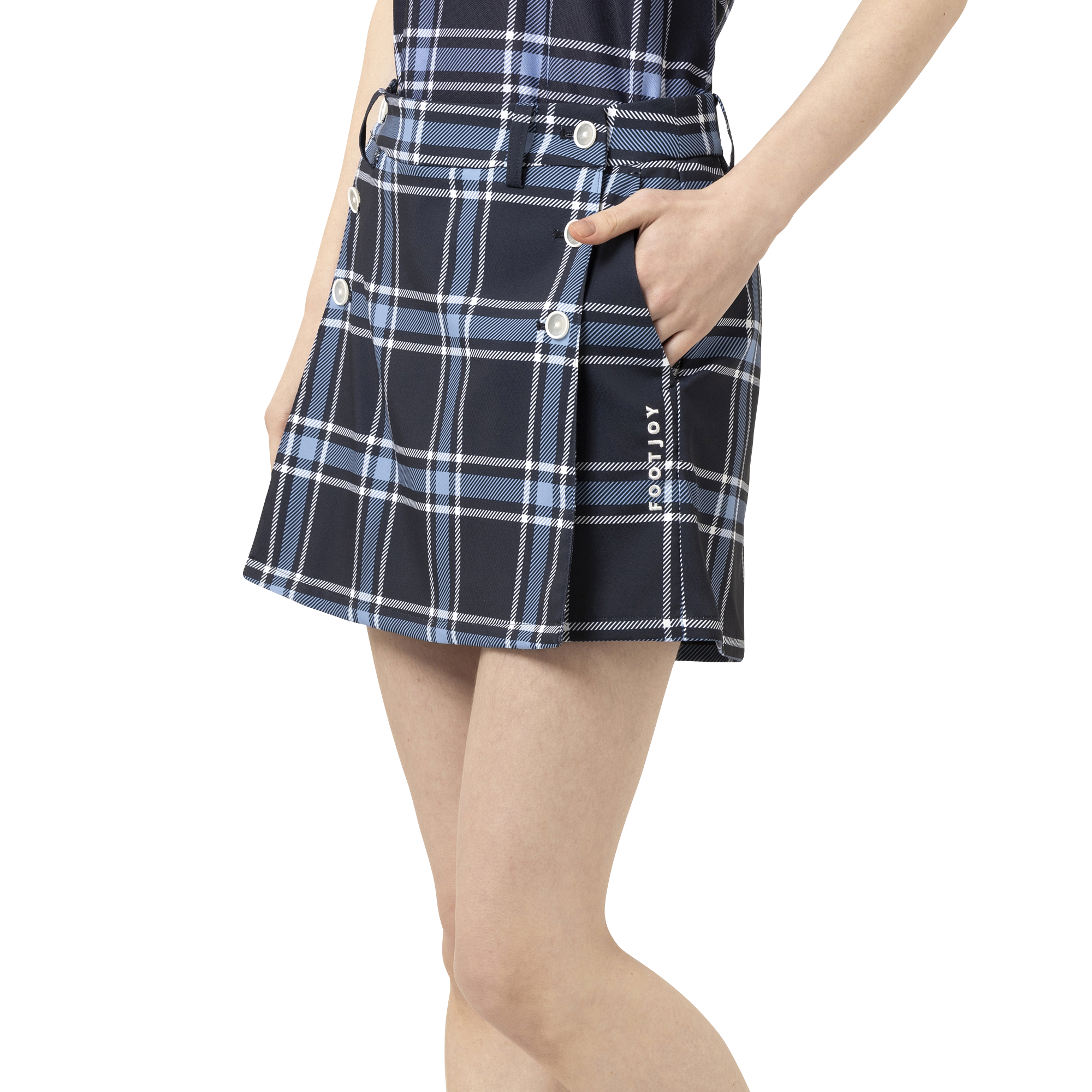 スカートキュロットのデザインは、製品前面の素材を取り外すことにより、ショートパンツとして着用することも可能。大胆なチェックデザインが上品な印象を演出します。