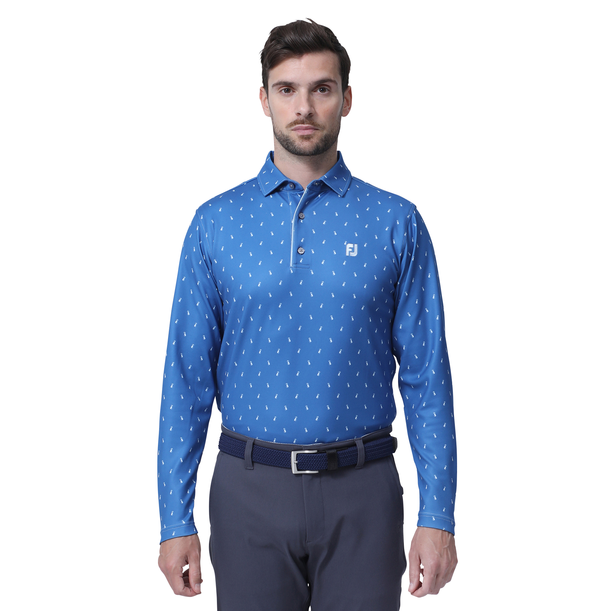 総柄に配置されたゴルフバッグがデザインポイントの長袖シャツ。