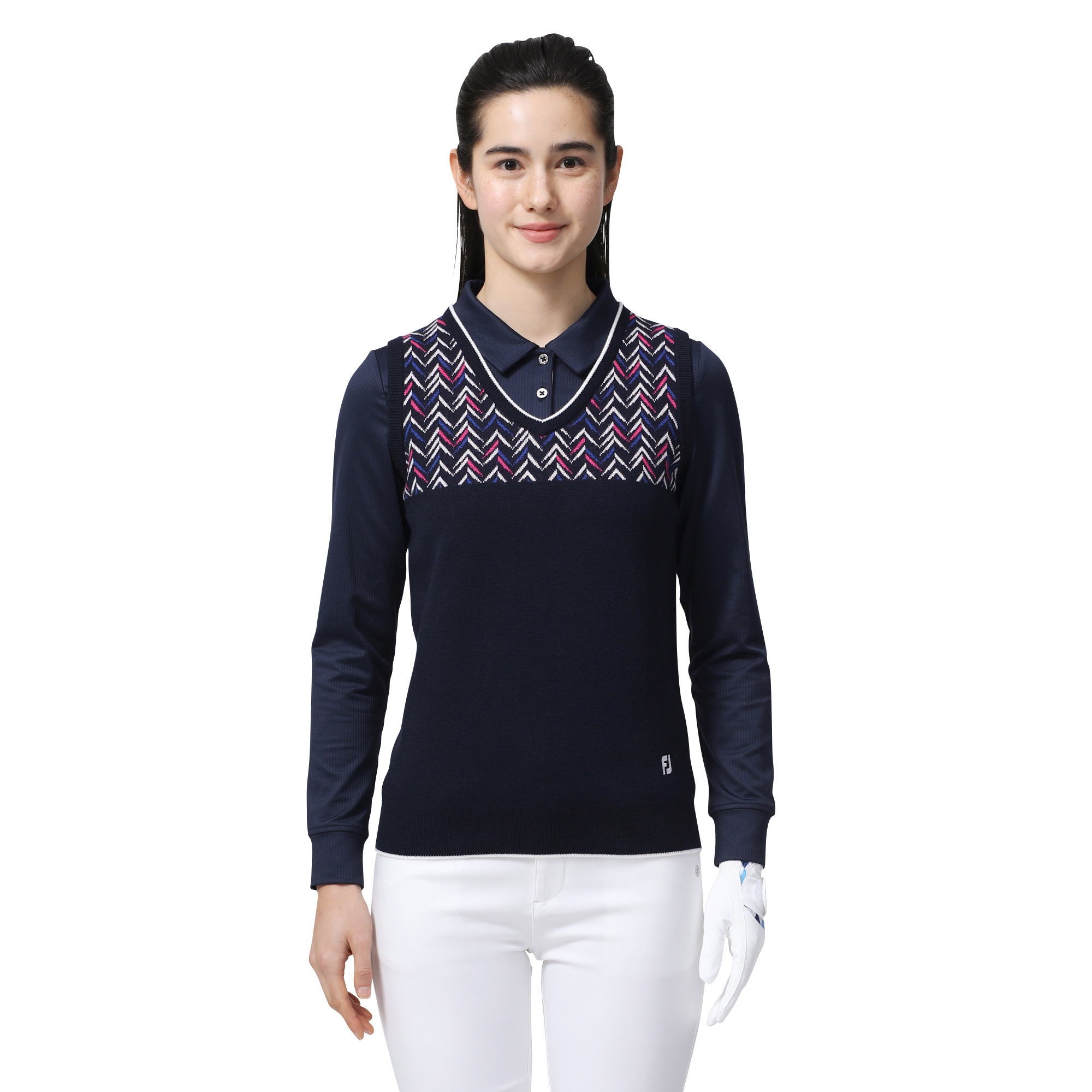 きちんと感のあるニットベストを、ジグザグのシェブロン柄と鮮やかなカラーリングでモダンにアップデート。