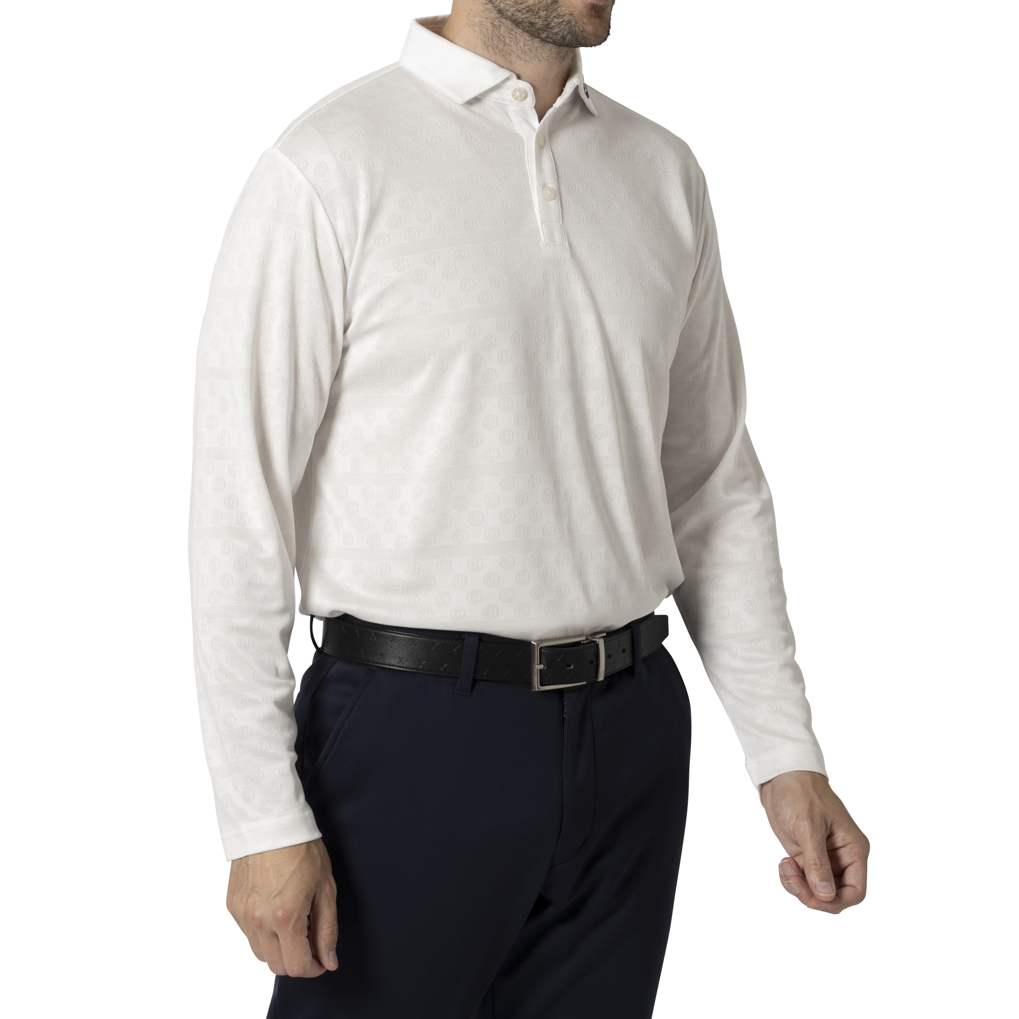 吸汗速乾性に優れた素材にジャカード組織でサークルFJロゴとラインボーダーを製品全体に配置した長袖ポロシャツ。ストレッチが効き、通気性に長けているため初秋のプレーに最適な1枚です。