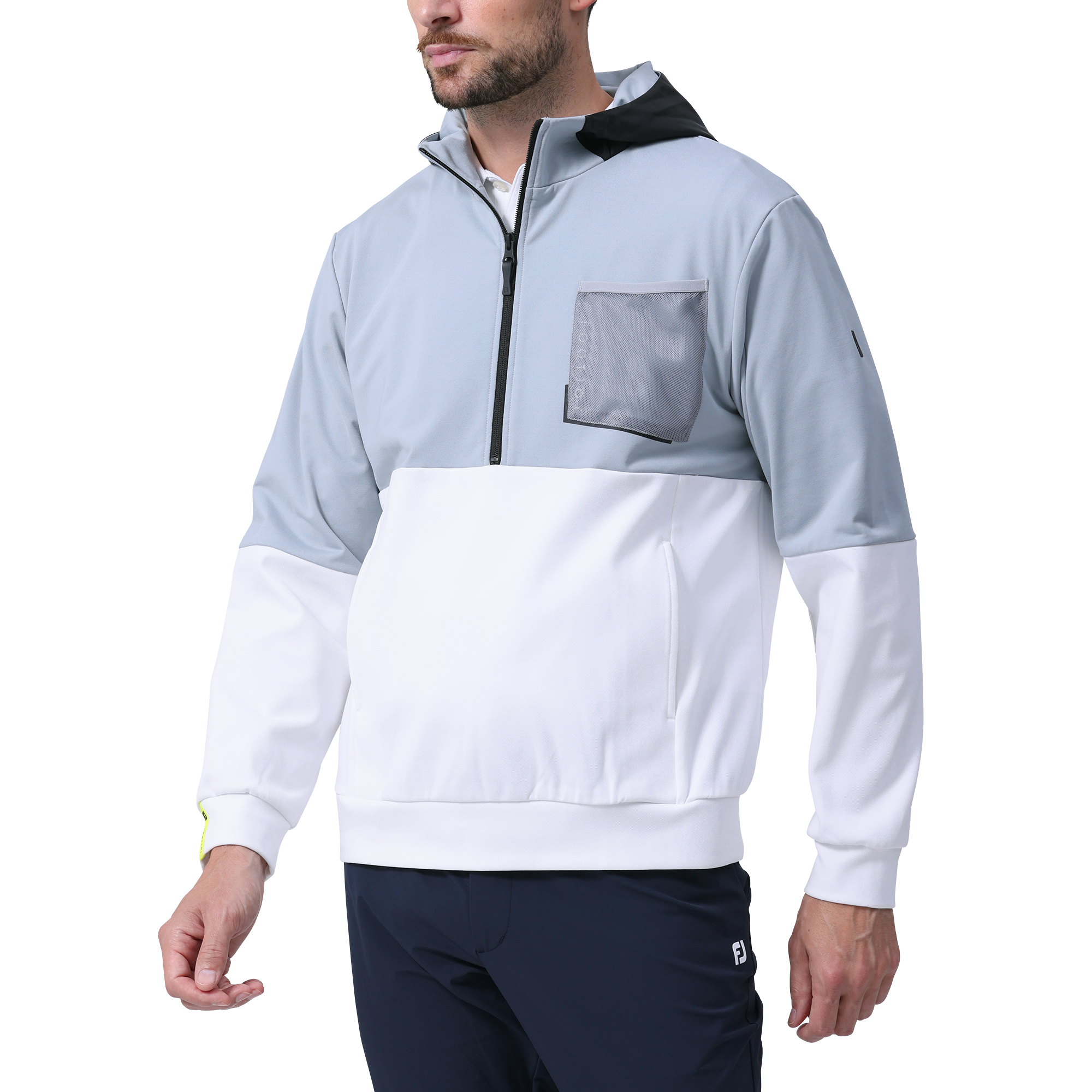 製品全体に撥水機能を施した2種類の素材をコンビネーションさせたハイブリット長袖フーディ。着脱のしやすさとスイングのしやすさを考慮したハーフジップデザインとなっています。左胸のメッシュポケットがデザインアクセントとなっています。
