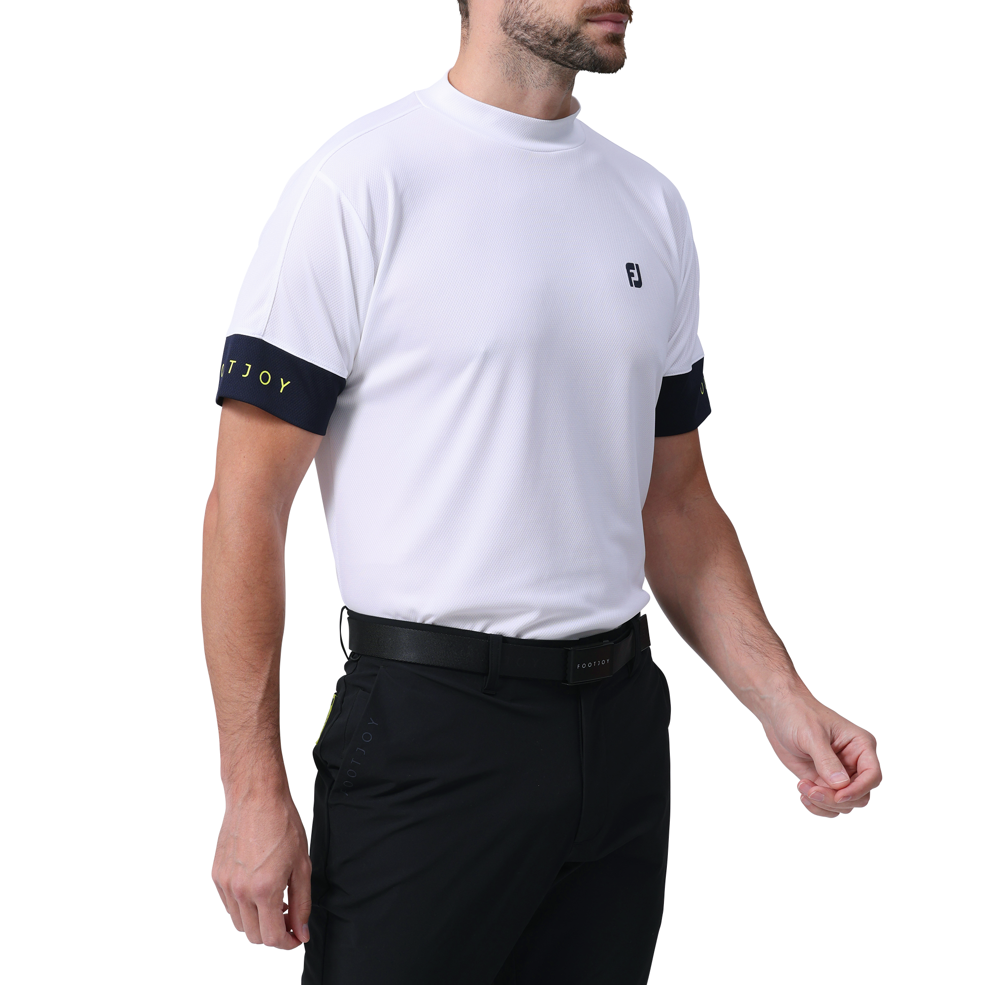 両袖先は素材切替えによる配色デザインとなっており、FOOTJOYのワードデザインを際立たせています。後身頃はスイングの快適性を追求したラウンドカッティングとなっています。