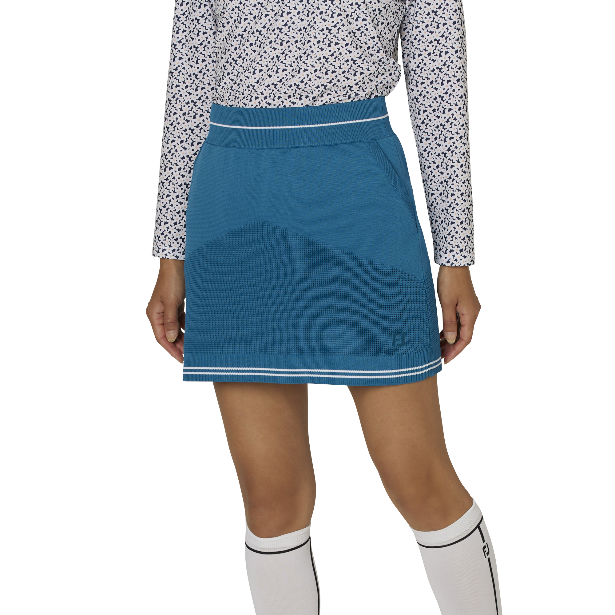 軽さが特徴のポリエステル素材を使用したニットプルオンスカート。上下で大胆な編地の切り替えを施し、ウエスト、裾に配色のラインを取り入れたシンプルでありながらもこだわりのあるデザイン。柔らかく通気性が良いためプレーに最適な1枚です。