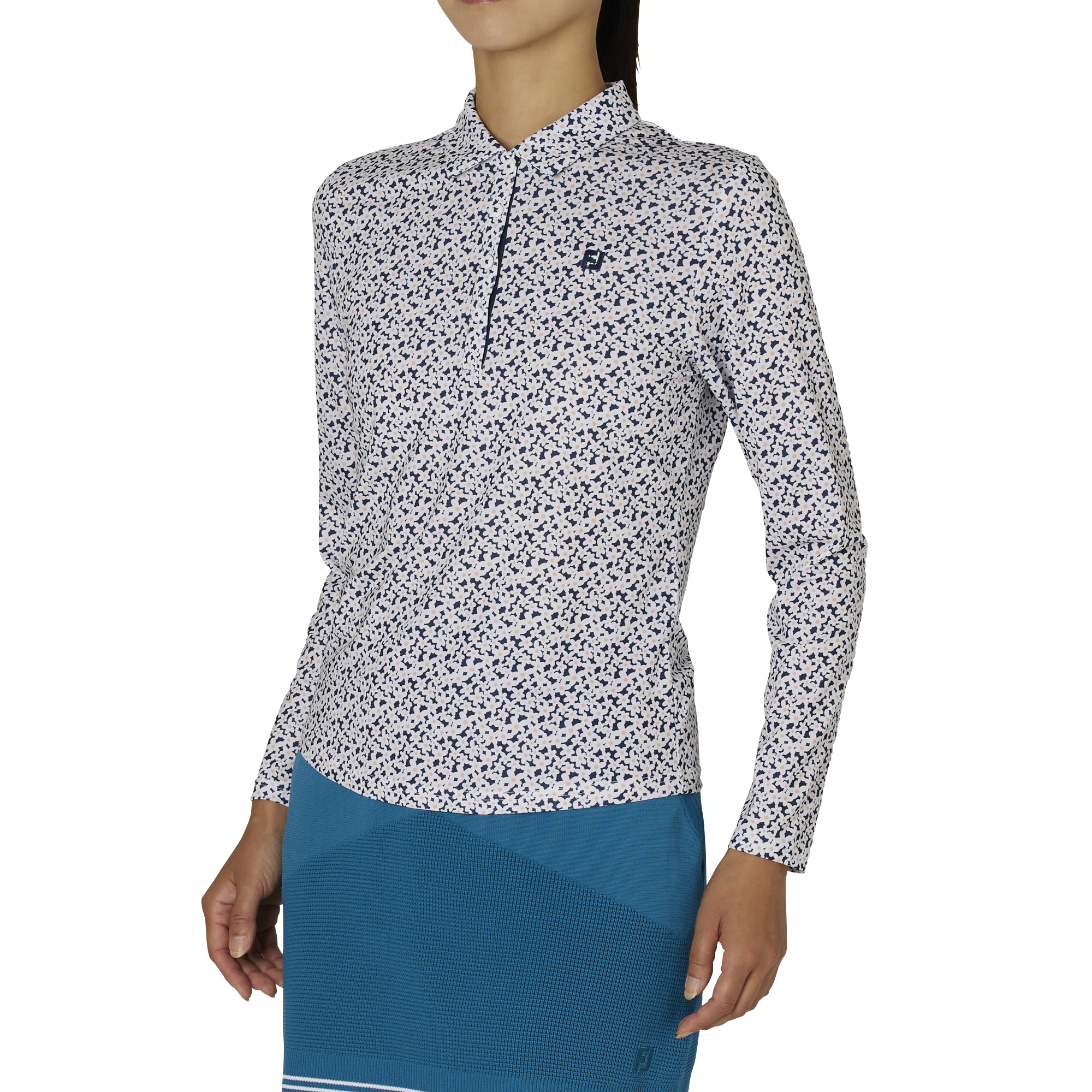フットジョイが誇る高ストレッチ素材を使用した長袖ポロシャツ。肌触りに優れたなめらかな表面感はストレスの無い快適なスイングを可能にします。手書きの花柄がプレーをより華やかにする1枚です。