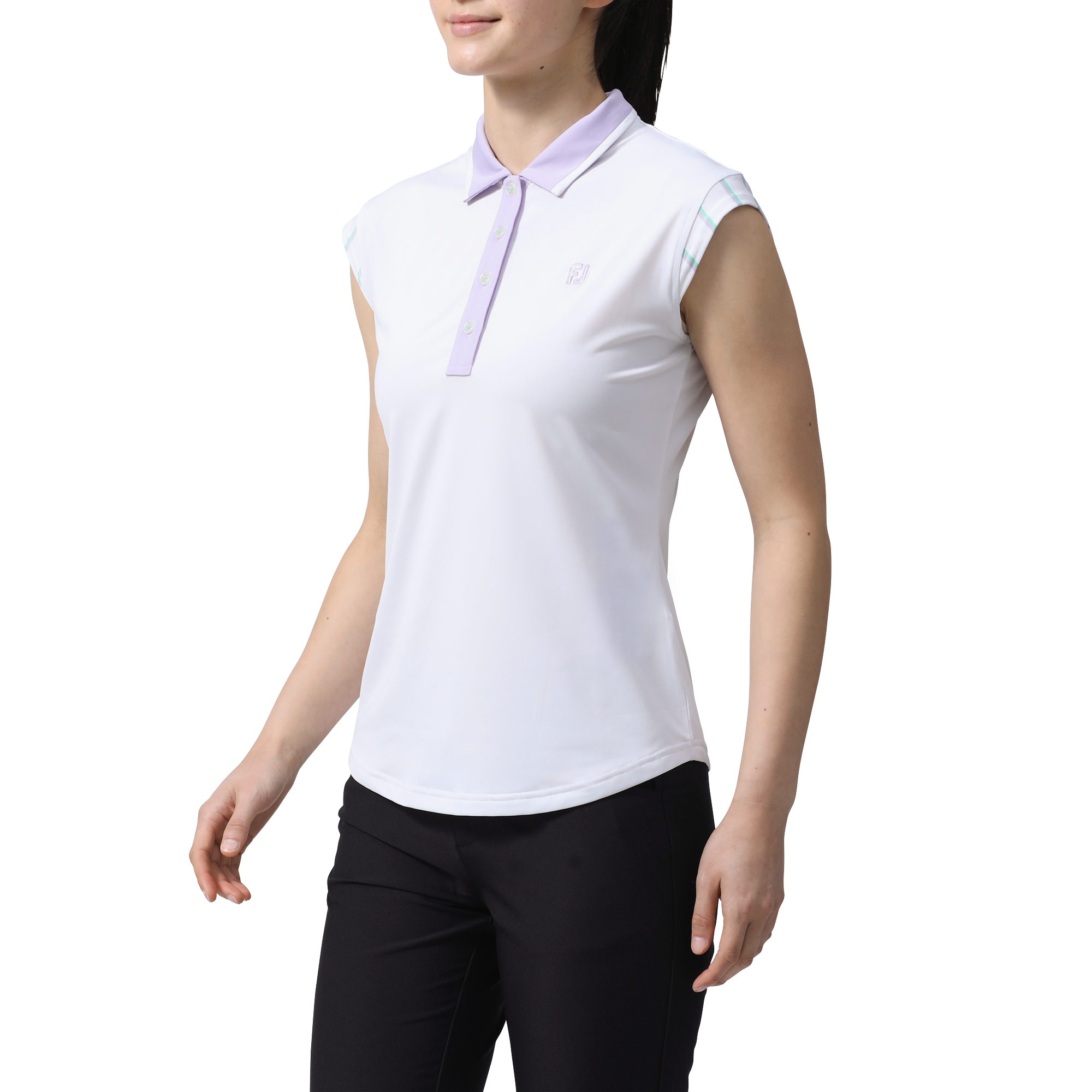 フットジョイが誇る高ストレッチ素材を使用したキャップスリーブシャツ。肌触りに優れたなめらかな表面感はストレスの無い快適なスイングを可能にします。袖口のストライプデザイン画、シンプルなアイテムの中でデザインのポイントとなっています。