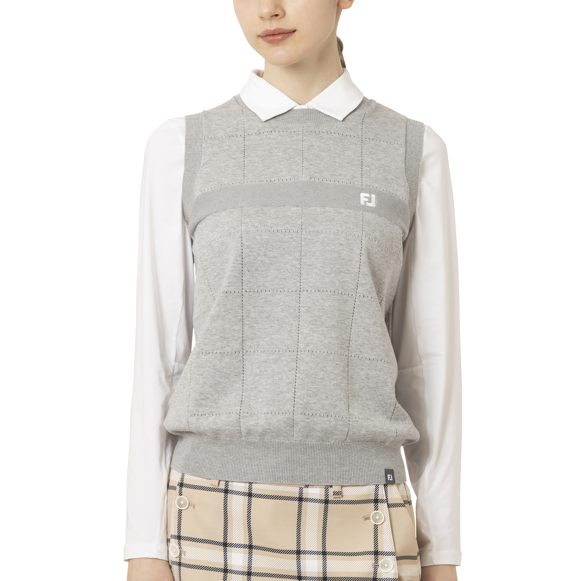 アイレットでスクエアチェック柄を表現したシンプルでありながらもこだわりのあるデザイン。快適な着心地が春先のプレーに最適な1枚です。