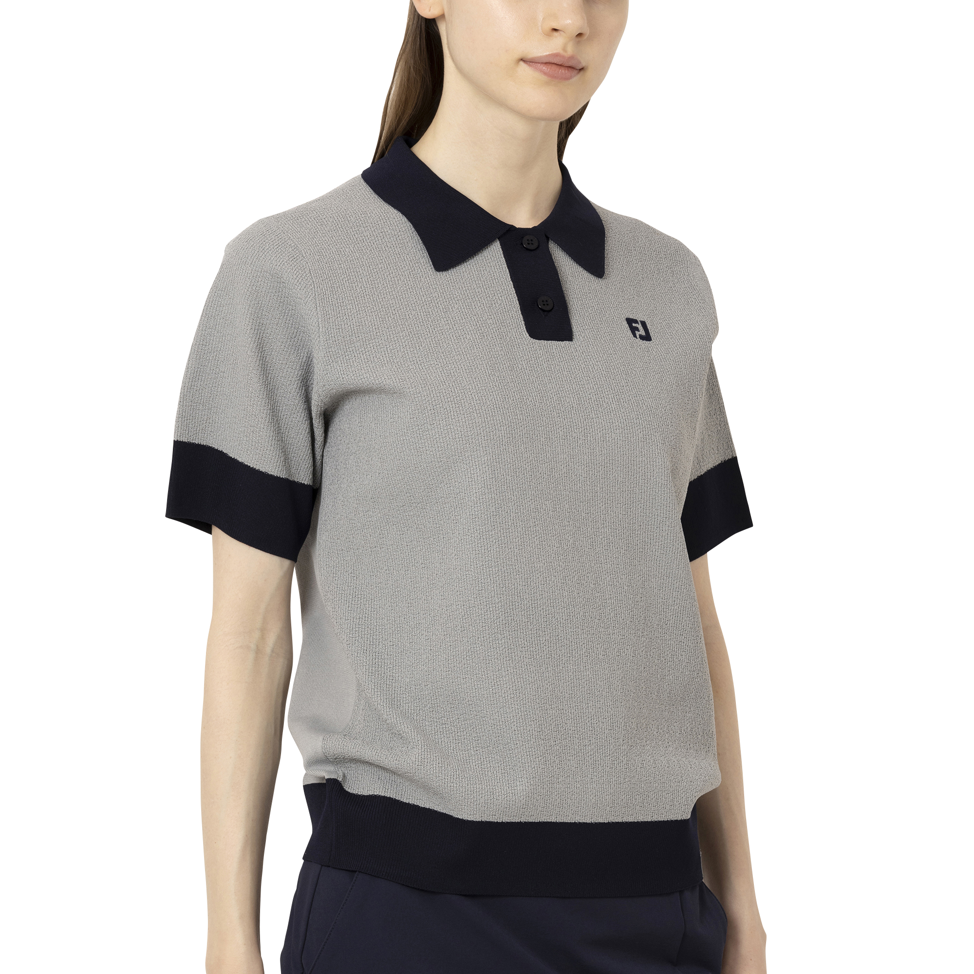 前面はシボ感のあるアムンゼン編み、後面は天竺編みで表現することで上品なデザインと快適な着心地を提供します。また、軽さが特徴のポリエステル素材を採用した半袖セーターで、通気性も良く、プレーに最適な1枚です。