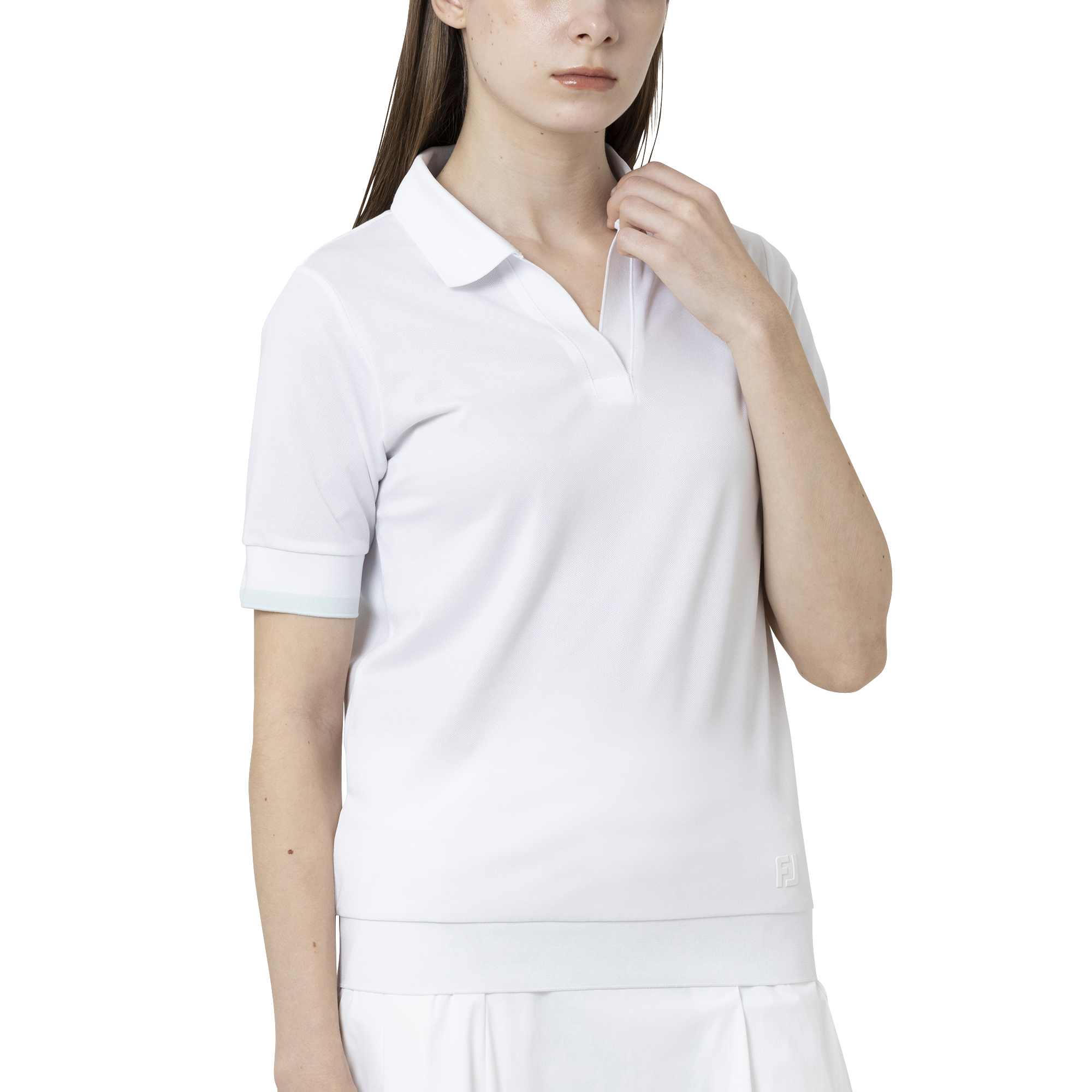 吸湿速乾・UVカット・抗菌性を備えた鹿の子素材を採用。高ストレッチ性の素材がスイングを柔軟にサポート。オープンプラケットとリブニットがアクティブに動いても美しいシルエットと品格を保ちます。
